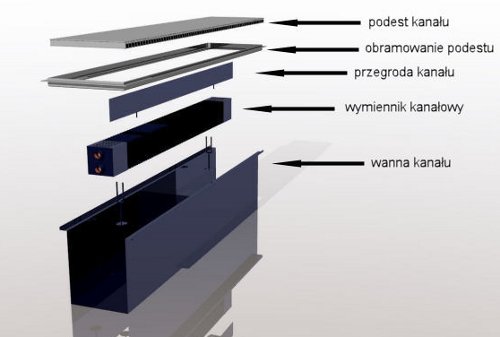 Grzejnik kanałowy (wymiennik kanałowy). Grzejnik składa się z dwóch układów: wodnego i układu oddawania ciepła. Układ wodny tworzą poziome, miedziane rury grzejne równomiernie rozmieszczone wewnątrz grzejnika i spięte na końcach pionowymi miedzianymi kolektorami zbiorczymi. Układ oddawania ciepła tworzą lamele z blachy aluminiowej osadzone pionowo na rurach grzejnych układu wodnego. Przednie i tylne krawędzie lamel tworzą przednią i tylną ścianę grzejnika. Wanna kanału wykonana jest z blachy ocynkowanej pokrytej granatową farbą proszkową o numerze RAL 5008.