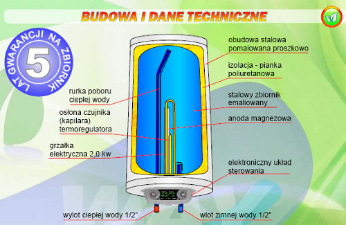By chronić ogrzewacz przed korozją, zastosowano specjalną emalię ceramiczną oraz anodę magnezową (wymienianą w gestii użytkownika).